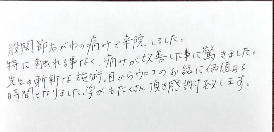 施術時にご説明いただいたことで、日々何に気をつけていれば 良いかもわかりました。”痛みが来そう”と思った時でも自身で対処できる ようになったと思います。